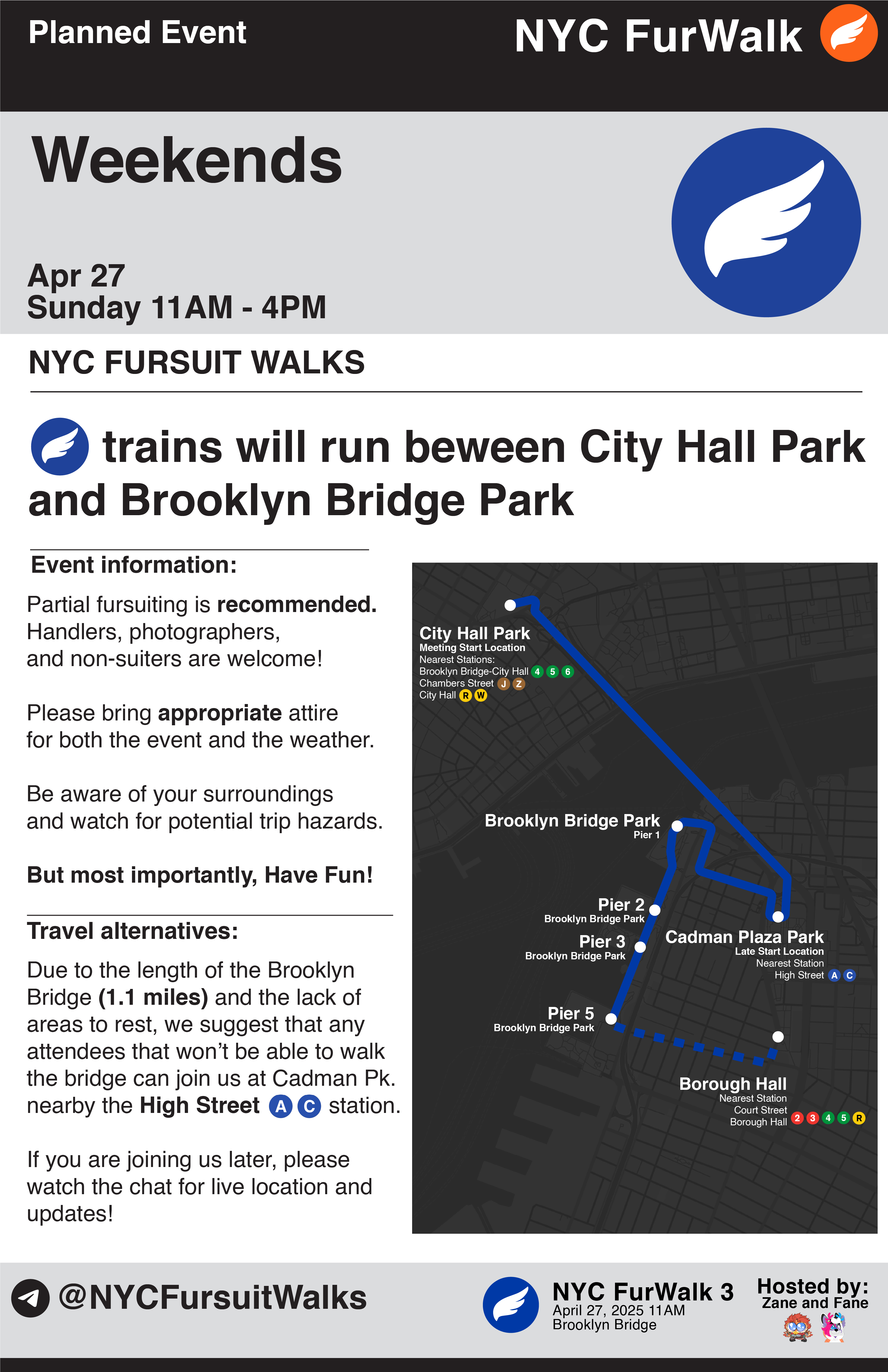That's right, NYC FurWalk's next route is in Brooklyn! We'll be starting in City Hall Park, Manhattan at 11 AM, where registration and suit-up will be. We'll start walking at 12 PM (+/- 30 minutes).